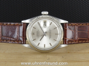 Original Oyster Perpetual Datejust Ref. 1601 mit Zifferblatt in silber und geriffelter Weissgoldlünette aus dem Jahr II 1972. Das Gehäuse und Plexiglas befinden sich in sehr gutem Zustand und weisen beinah keine Gebrauchsspuren auf. An der Uhr befindet sich ein rotbraunes Alligator Lederband welches neu und ungetragen ist. Das original Jubilèband wird mitgeliefert und kann gegebenenfalls auch getragen werden. Das Automatik Uhrwerk ist überholt, kontrolliert und läuft einwandfrei. Bei der Uhr handelt es sich um das Herrenmodell mit einem Durchmesser von 36 mm, welches auch sehr gerne von Damen getragen wird. Der Rolex Klassiker schlechhin! Die Lieferung erfolgt mit Serviceetui, Rechnung von Classic Watches und CW-Garantiezertifikat.