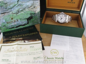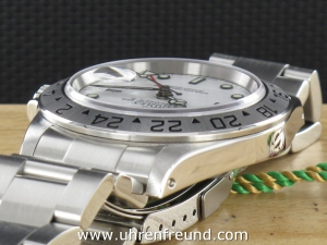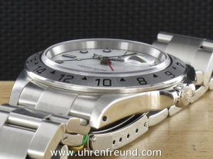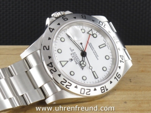 Original Rolex Explorer II ref. 16570 mit weissem Zifferblatt aus dem Jahr 2003 mit Verkaufsdatum 28.11.2003. Das Gehäuse und Band befinden sich in sehr gutem Zustand und weisen nahezu keine Gebrauchsspuren auf. Die Uhr kann als neuwertig bezeichnet werden. Das Uhrwerk ist überholt, kontrolliert und läuft einwandfrei. Die Lieferung erfolgt incl. Box, Originalzertifikat, Rechnung von Classic Watches sowie CW - Garantiezertifikat.