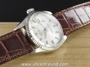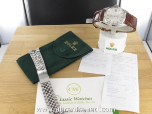 Original Oyster Perpetual Datejust Ref. 1601 mit Zifferblatt in silber und geriffelter Weissgoldlünette aus dem Jahr II 1972. Das Gehäuse und Plexiglas befinden sich in sehr gutem Zustand und weisen beinah keine Gebrauchsspuren auf. An der Uhr befindet sich ein rotbraunes Alligator Lederband welches neu und ungetragen ist. Das original Jubilèband wird mitgeliefert und kann gegebenenfalls auch getragen werden. Das Automatik Uhrwerk ist überholt, kontrolliert und läuft einwandfrei. Bei der Uhr handelt es sich um das Herrenmodell mit einem Durchmesser von 36 mm, welches auch sehr gerne von Damen getragen wird. Der Rolex Klassiker schlechhin! Die Lieferung erfolgt mit Serviceetui, Rechnung von Classic Watches und CW-Garantiezertifikat.