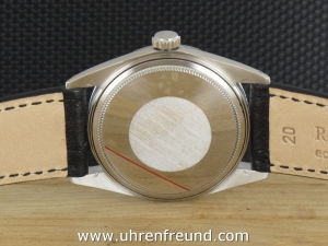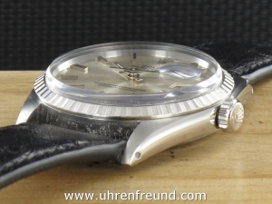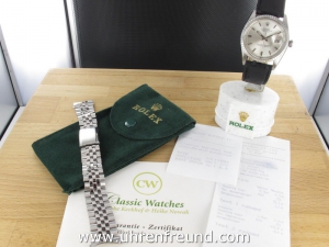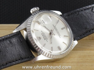 Original Oyster Perpetual Datejust Ref. 1603 mit Zifferblatt in silber und geriffelter Stahllünette aus dem Jahr VI 1966. Das Gehäuse und Plexiglas befinden sich in sehr gutem Zustand und weisen beinah keine Gebrauchsspuren auf. An der Uhr befindet sich ein schwarzes Strauß Lederband welches neu und ungetragen ist. Das original Jubilèband wird mitgeliefert und kann noch gut getragen werden. Das Automatik Uhrwerk ist überholt, kontrolliert und läuft einwandfrei. Bei der Uhr handelt es sich um das Herrenmodell mit einem Durchmesser von 36 mm, welches auch sehr gerne von Damen getragen wird. Der Rolex Klassiker schlechhin! Die Lieferung erfolgt mit Serviceetui, Rechnung von Classic Watches und CW-Garantiezertifikat.