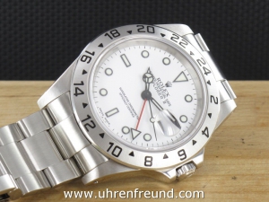 Original Rolex Explorer II ref. 16570 mit weissem Zifferblatt aus dem Jahr 2003 mit Verkaufsdatum 28.11.2003. Das Gehäuse und Band befinden sich in sehr gutem Zustand und weisen nahezu keine Gebrauchsspuren auf. Die Uhr kann als neuwertig bezeichnet werden. Das Uhrwerk ist überholt, kontrolliert und läuft einwandfrei. Die Lieferung erfolgt incl. Box, Originalzertifikat, Rechnung von Classic Watches sowie CW - Garantiezertifikat.